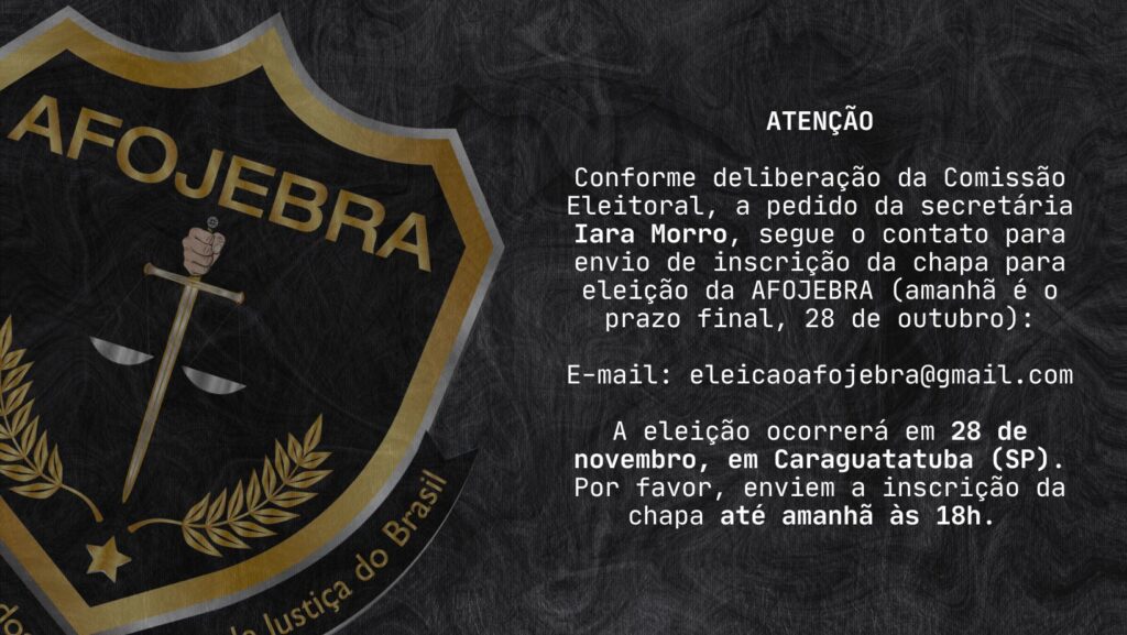 ATENÇÃO Conforme deliberação da Comissão Eleitoral, a pedido da secretária Iara Morro, segue o contato para envio da inscrição da chapa para eleição da AFOJEBRA (amanhã é o...